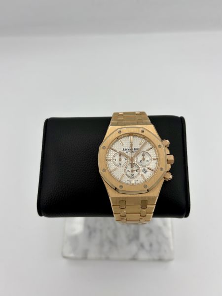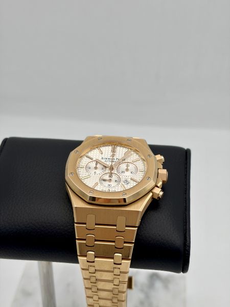 Tuotannosta jo poistunut klassikko Audemars Piguet Royal Oak Chronograph ref 26320OR.OO.D088CR.01 ruusukultaisena. APn valkoinen vohvelitaulu on super näyttävä, vertaansa vailla.