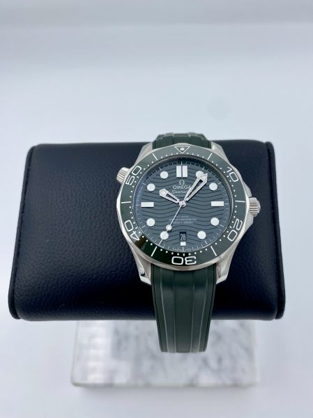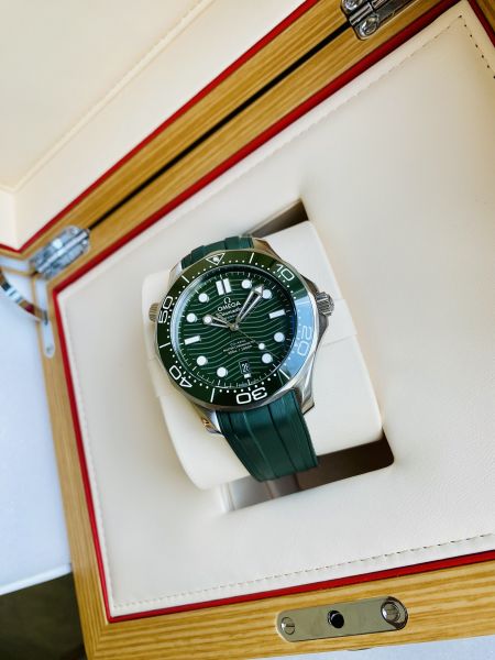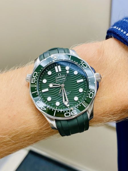 Omega Seamaster diver 42mm (300m). Uusi Vihreä myös "Seaweed" nimellä tunnettu taulu on todella näyttävä. Pimeässä valaistuksessa vihreä taittuu todella tumman väriseksi ja aika ajoin voi näyttää jopa mustalta. Kirkkaassa auringon valossa vihreä pääsee loistamaan ja taulun aalto kuvio viimeistelee tyyllikkään kokonaisuuden.