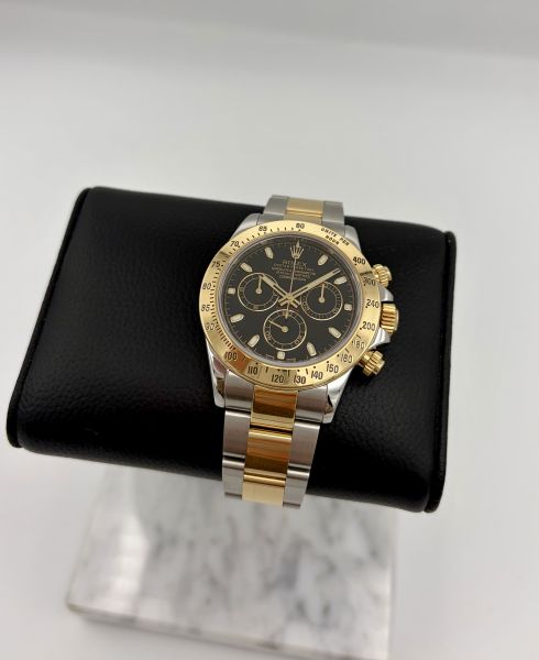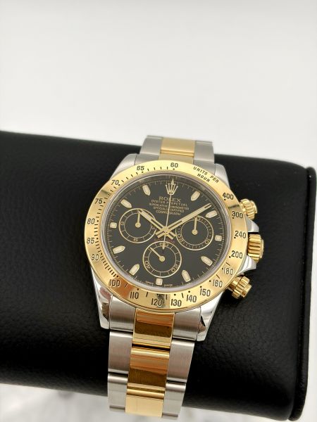 Näyttävä tuotannosta jo poistunut Rolex Daytona 116523 mustalla taululla. Mustan taulun ja kullan yhdistelmä on kiistatta näyttävä.
