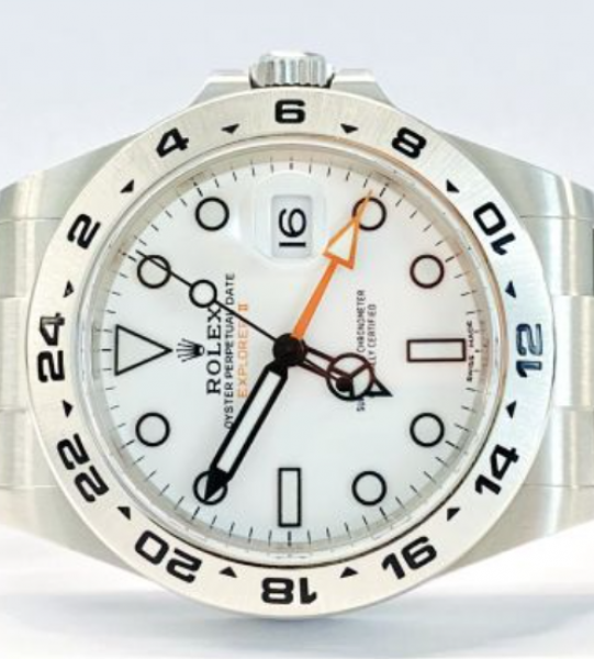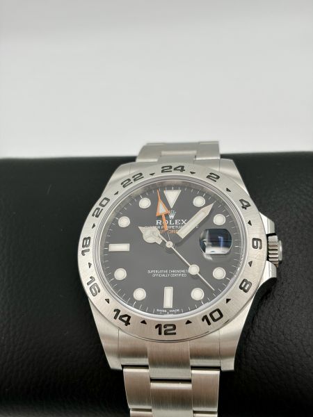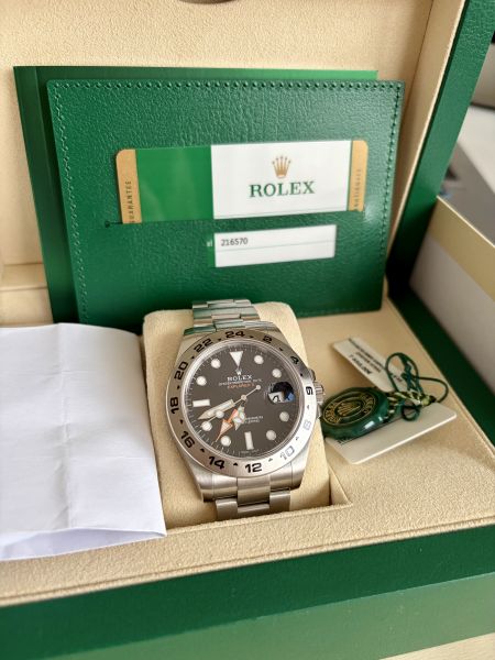 Hienossa kunnossa oleva Rolex Explorer II ref 216570. Mustalla ja valkoisella taululla.