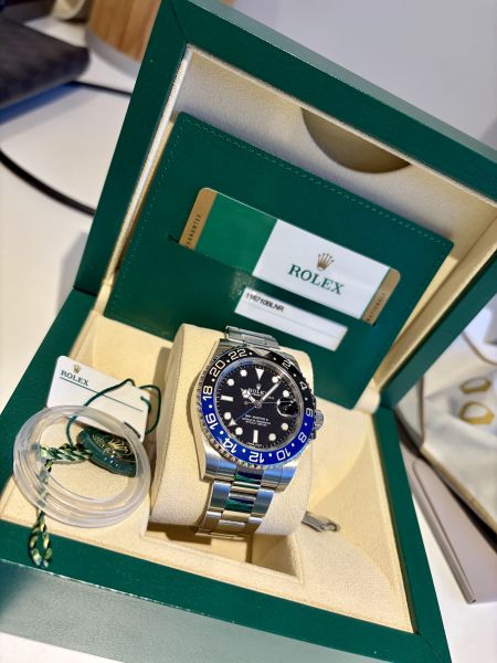 Tuotannosta jo poistunut klassikko Rolex GMT-Master II aka Batman upealla sinimustalla kehällä.