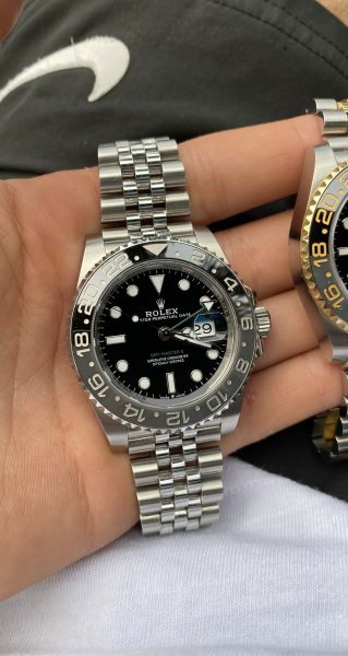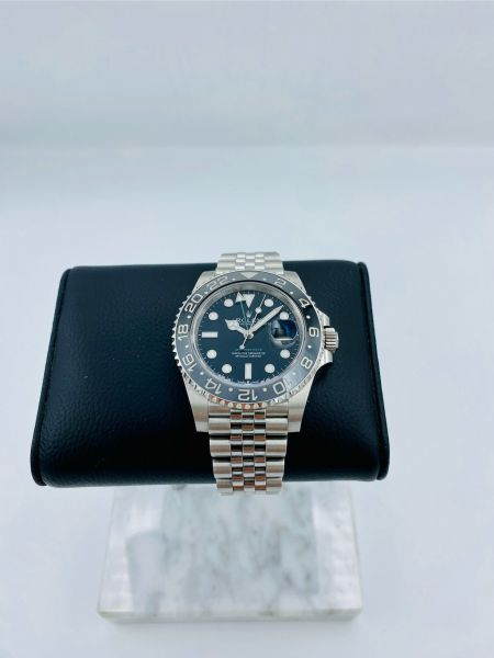 Todella hienossa kunnossa oleva uusimman sukupolven GMT-Master II näyttävällä harmaa-mustalla kehällä. Vihreät detaljit kruunaavat kokonaisuuden.