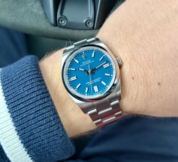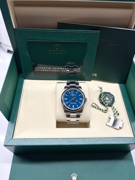 Uutta vastaavassa kunnossa oleva Rolex Oyster Perpetual ref 126000 todella upealla uudella Med Blue taululla. Taulun väriä on vaikea saada kuviin, taulun väri on hyvin lähellä "Petrooli" sävyä. Uutuus taulu!