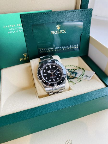 Hienossa kunnossa oleva Rolex Sea-Dweller 126600 RED. Vaikka kello on reilun kokoinen (43mm) istuu se ranteeseen erittäin hienosti. Kellon kuoren muotoilu ja mukava Oyster ranneke luo hienon kokonaisuuden, jonka kruuna punainen teksti mustassa taulussa.