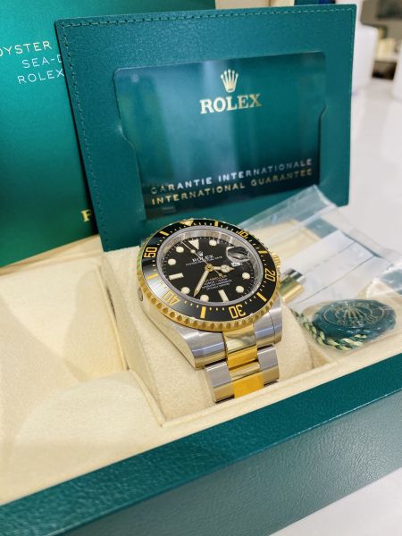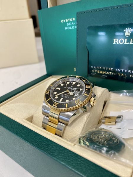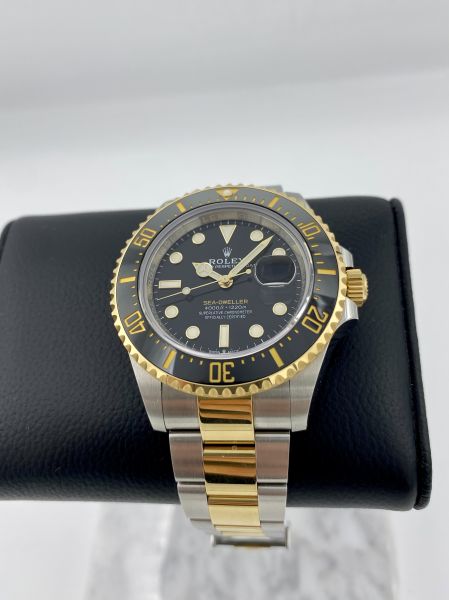 Todella näyttävä jämerää tekoa oleva Rolex Sea-Dweller 126603 mustalla taululla ja teräs-kulta rannekkeella.
