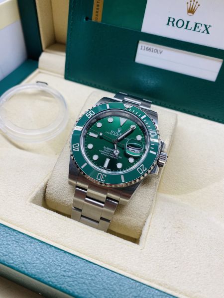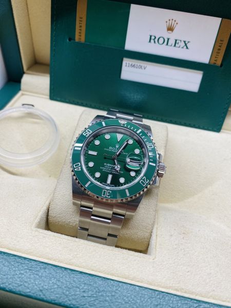 Tuotannosta jo poistunut Rolex Submariner 116610LV aka "Hulk". Kellon alkuperäiset viisteet ovat edelleen todella terävät ja kello on hienossa kunnossa.