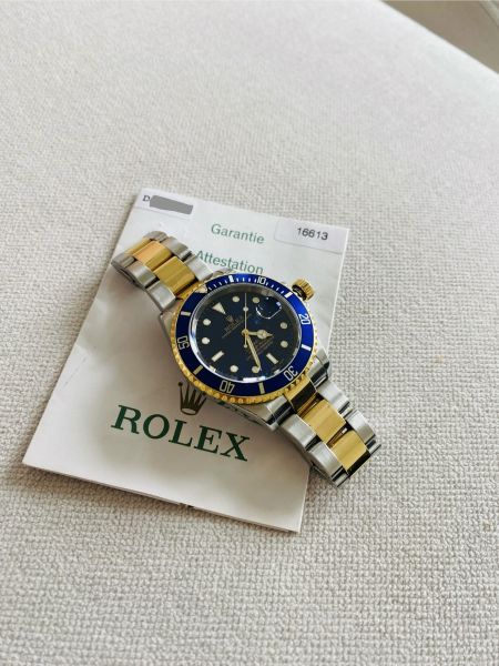 Rolex Submariner ref 16613 T tulossa myyntiin huollon jälkeen, Kello on D-sarjaa, elikkä valmistusvuosi on 2005-2006. Kelloa seuraa sen alkuperäiset paperit. Ref 16613 T Submarinerista löytyy muunmuassa jo "Solid endlink" päätypalat, "No lug holes" koppa ja läpikultainen claspi.