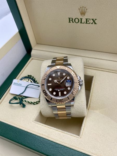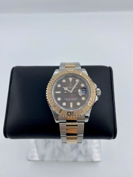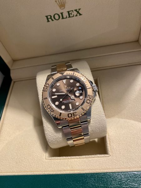 Rolex Yacht-Master ref 126621 todella upealla ruskealla suklaataululla. Harvinaisempi kombinaatio jota ei ihan joka päivä tule vastaan. Ruusukultaisen kokonaisuuden kruunaa punainen Yacht-Master teksti taulussa.